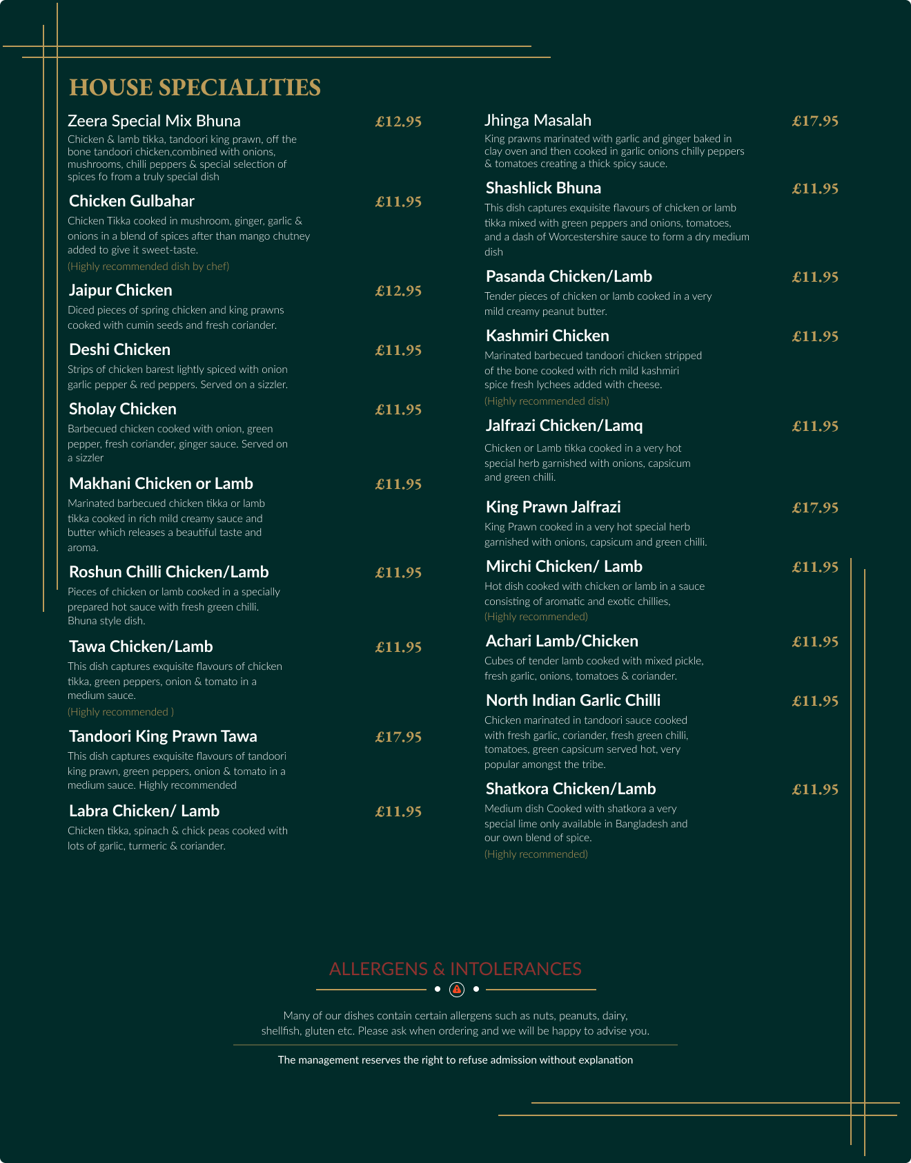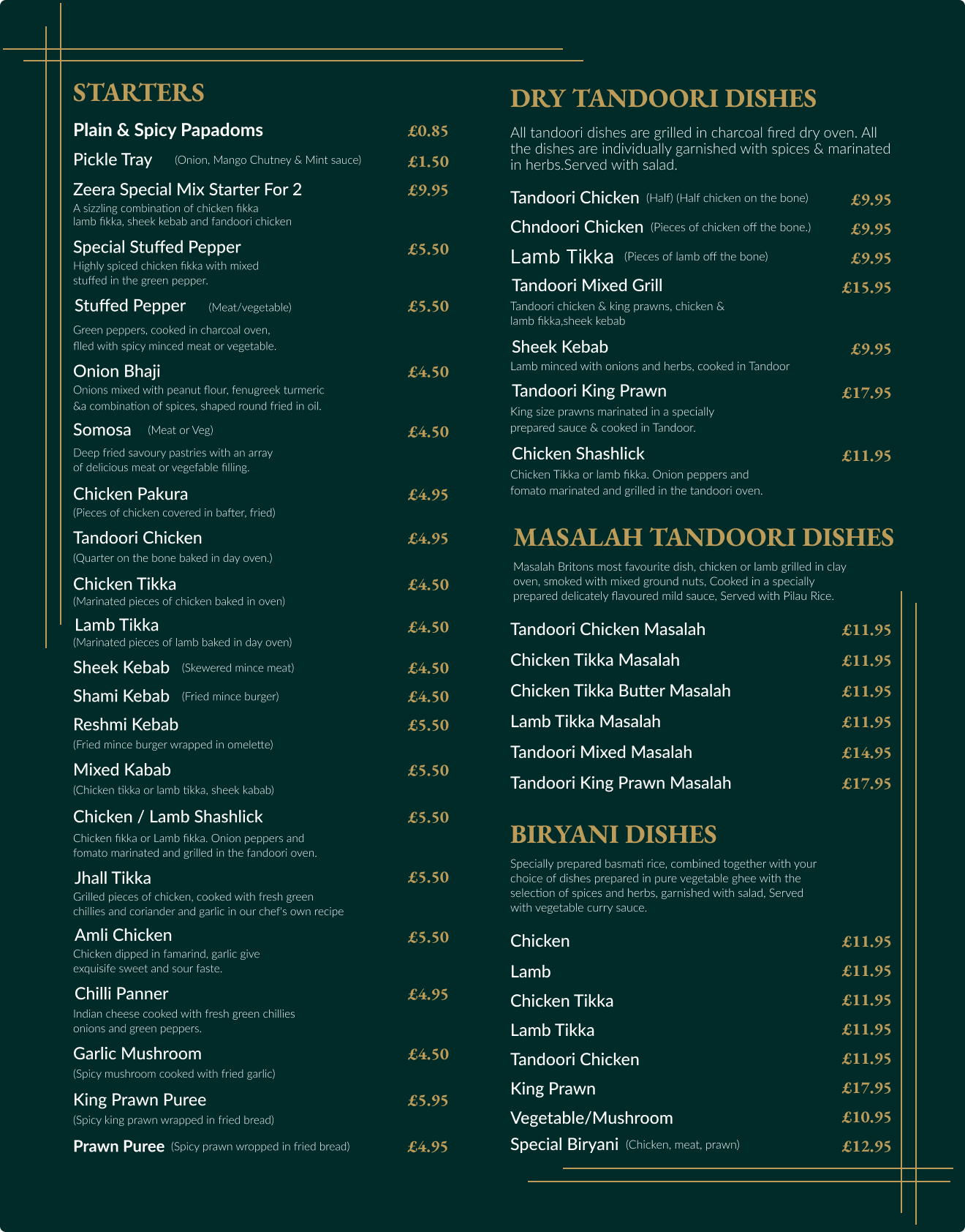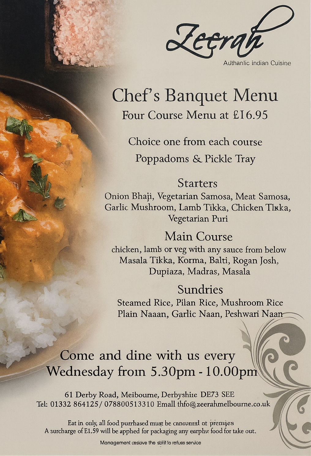 Explore Our Menu Authentic flavours, made fresh every day and prepared with the care and craftsmanship you expect from Zeerah. Takeway menu Dessert menu Wednesday Banquet Evening